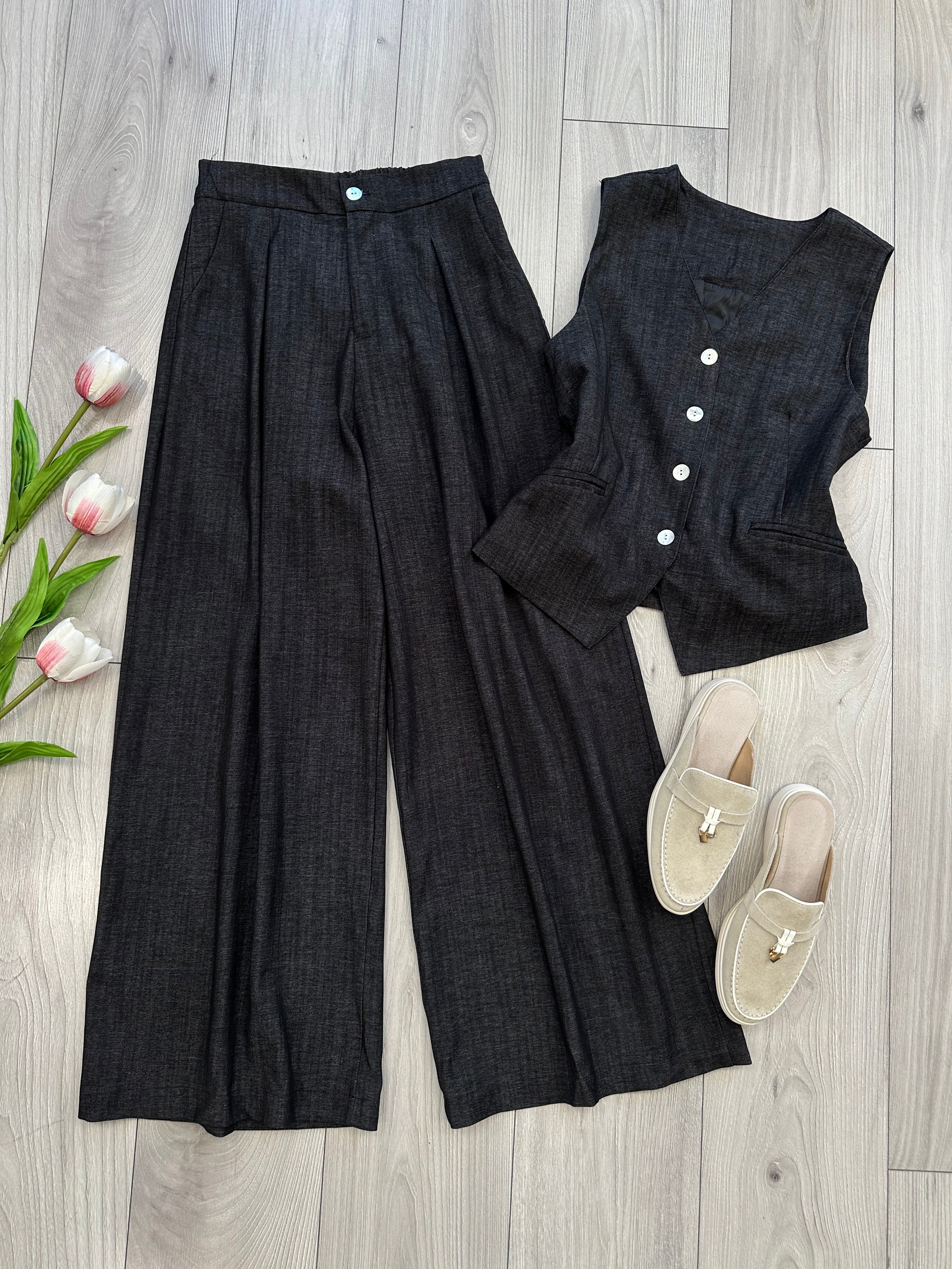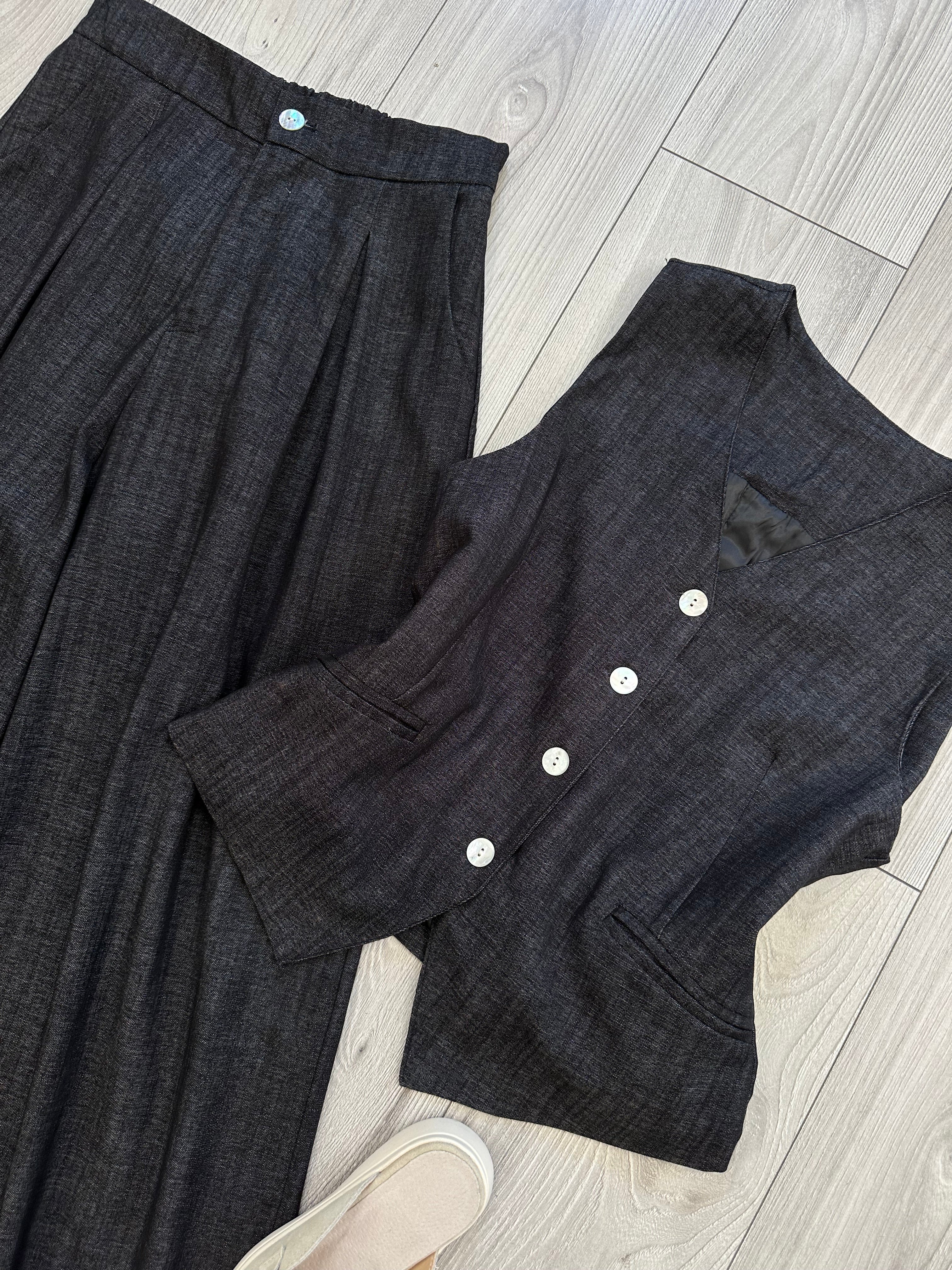 Kostum pantallona te gjera+ jelek me lidhese nga pas qe thekson belin