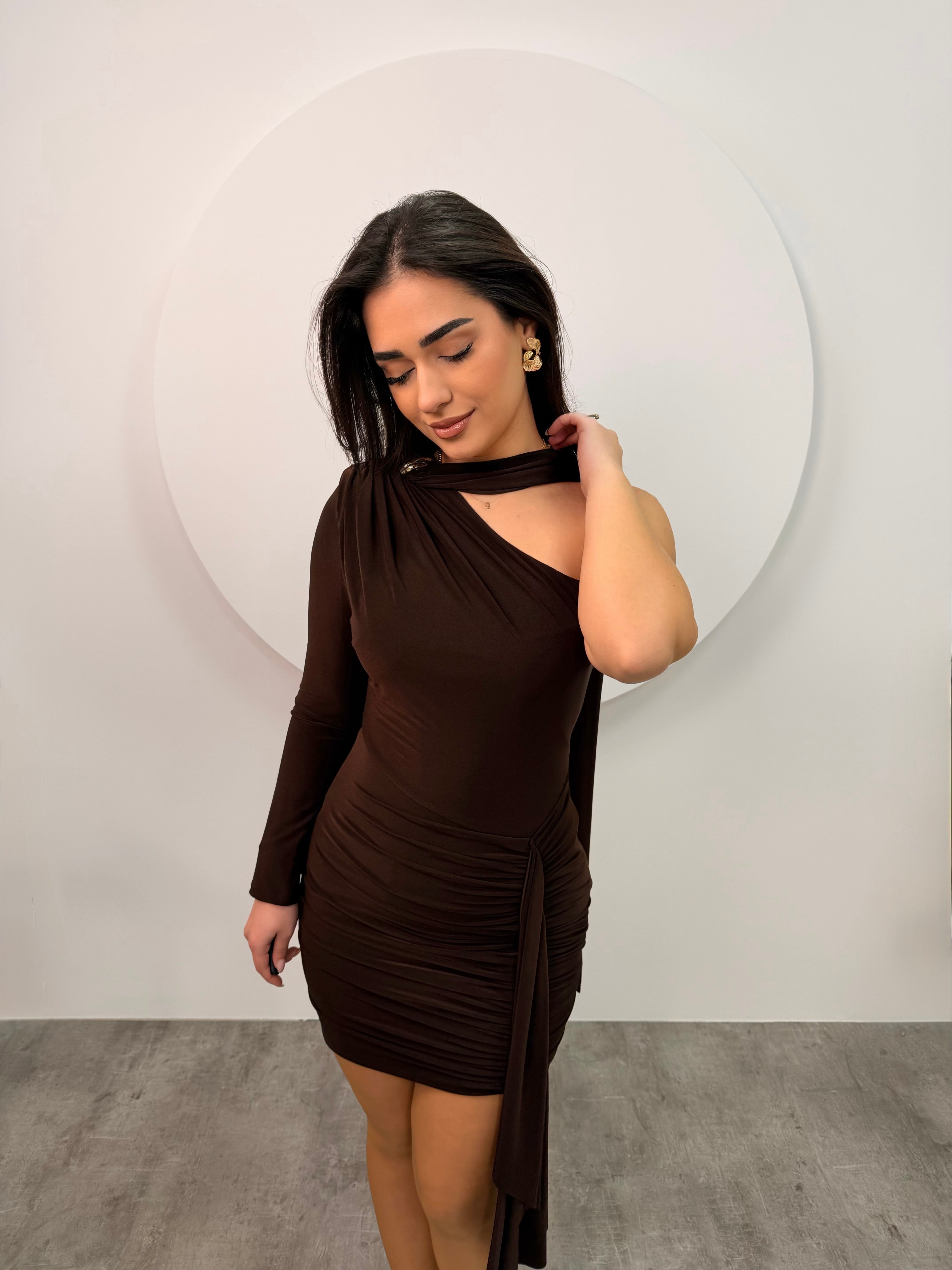 Nje fustan klasik material elastik. Qendron pas trupi ne menyre ideale. Me nje shall perpara e nje ne qafe qe hidhet pas ne forme shume elegante đź’•