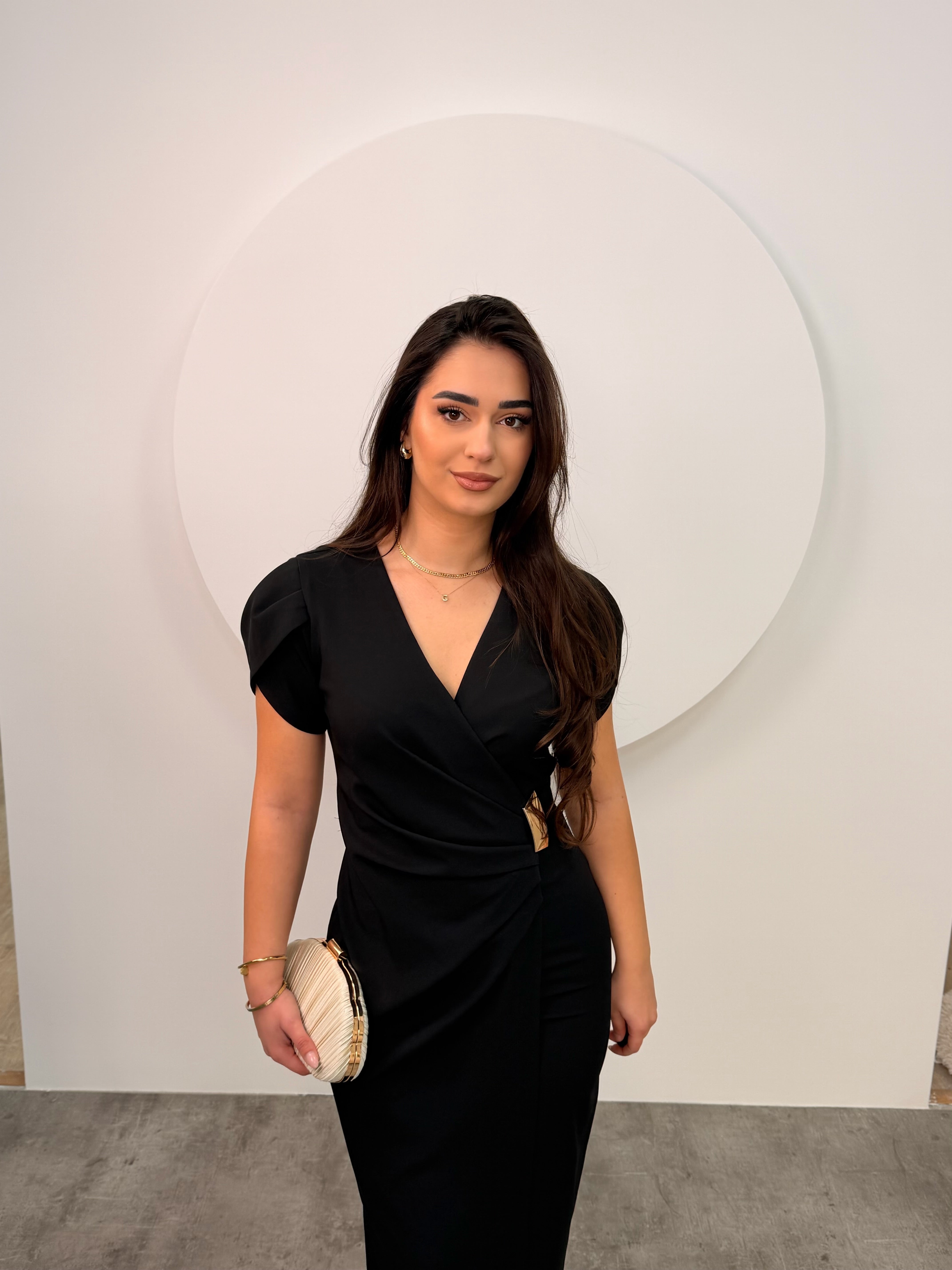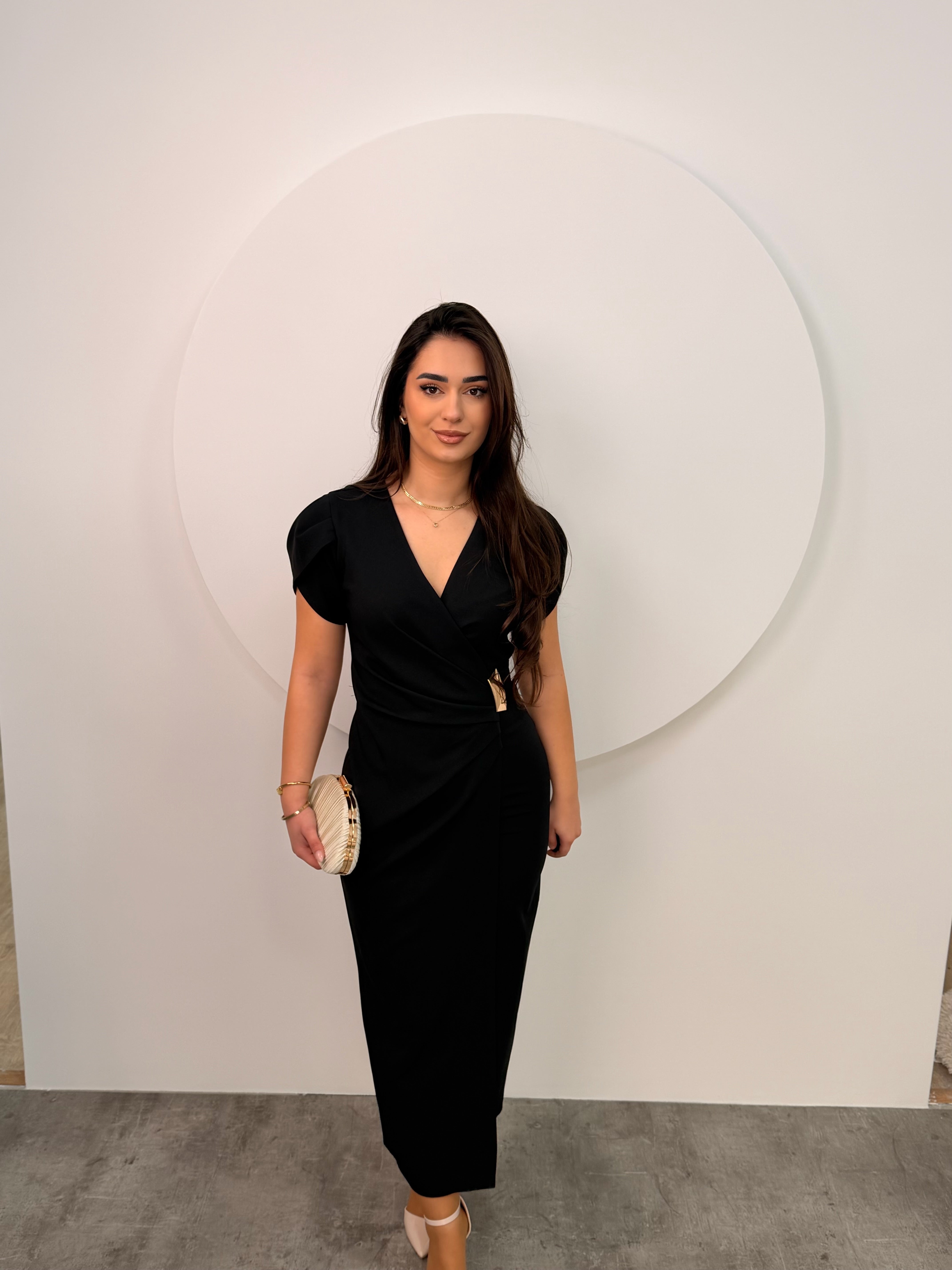 Nje fustan elegant pas trupi, me rrudha ne pjesen perpara, me dekolte ne forme V dhe gjatesi perfekte! 💕