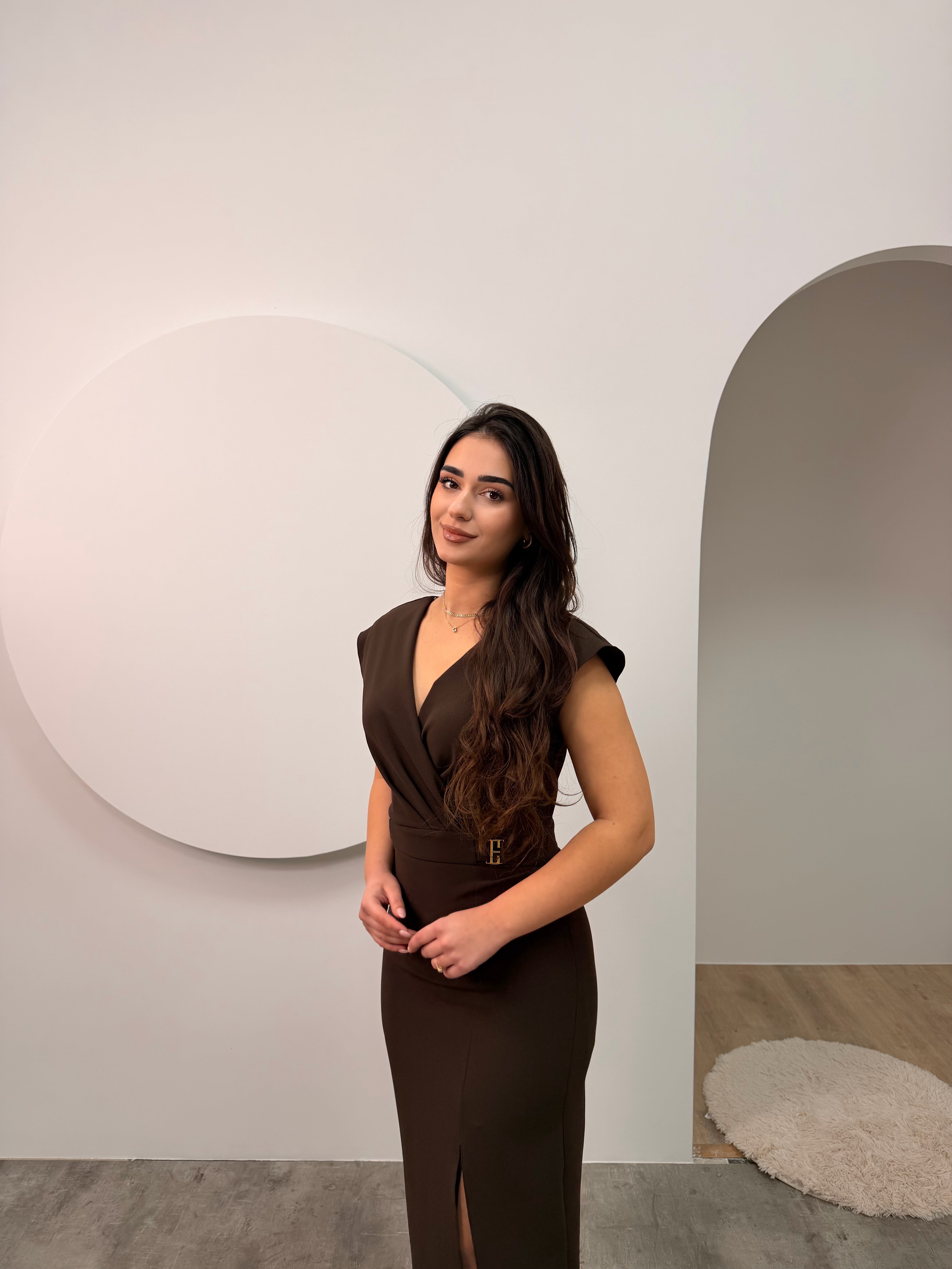 Fustan klasik ne ngjyre kafe. Plot sharm dhe finese