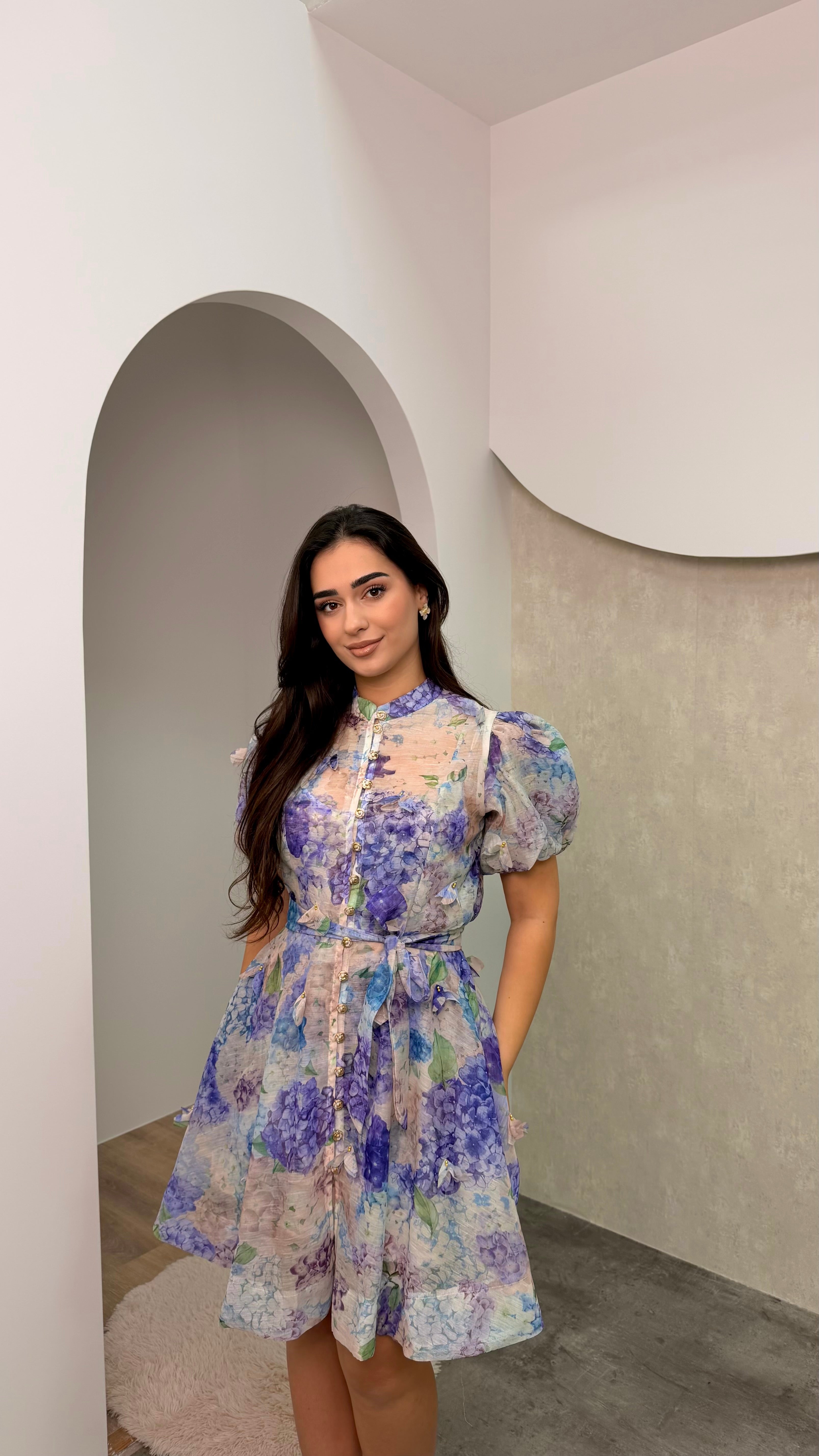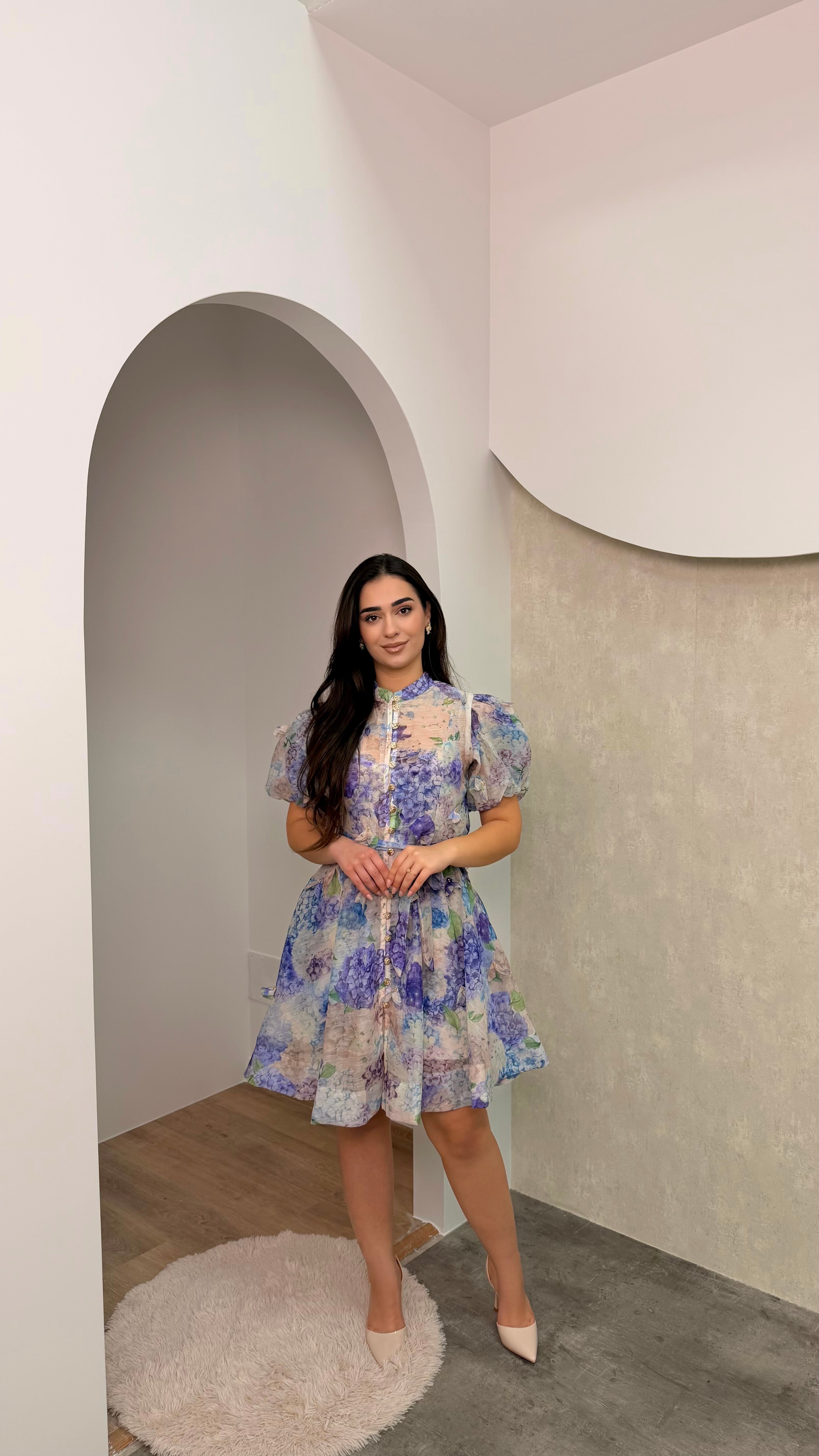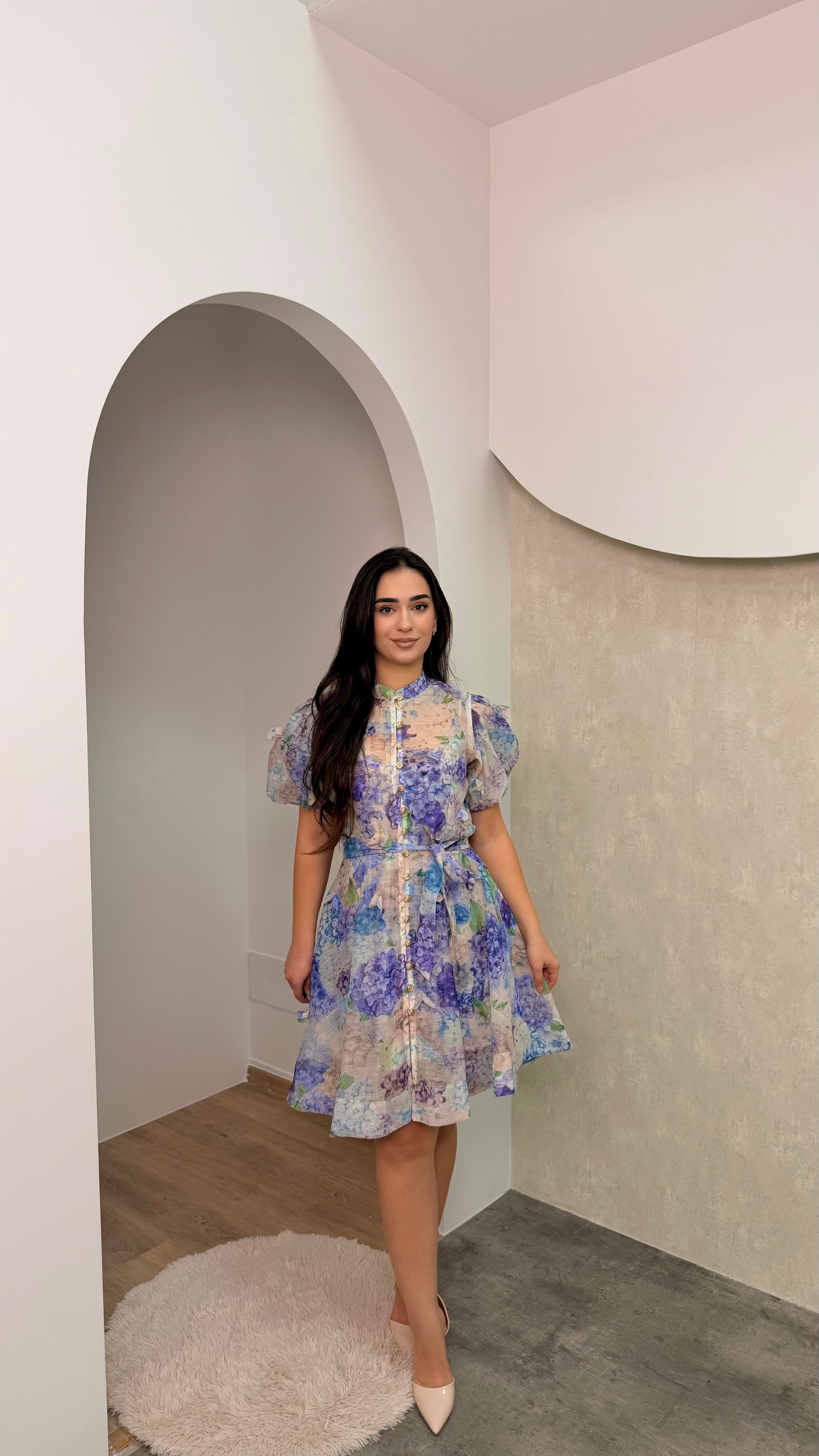 Fustan me lule me gjatesi komode. Nuanca pranverore dhe teper terheqese