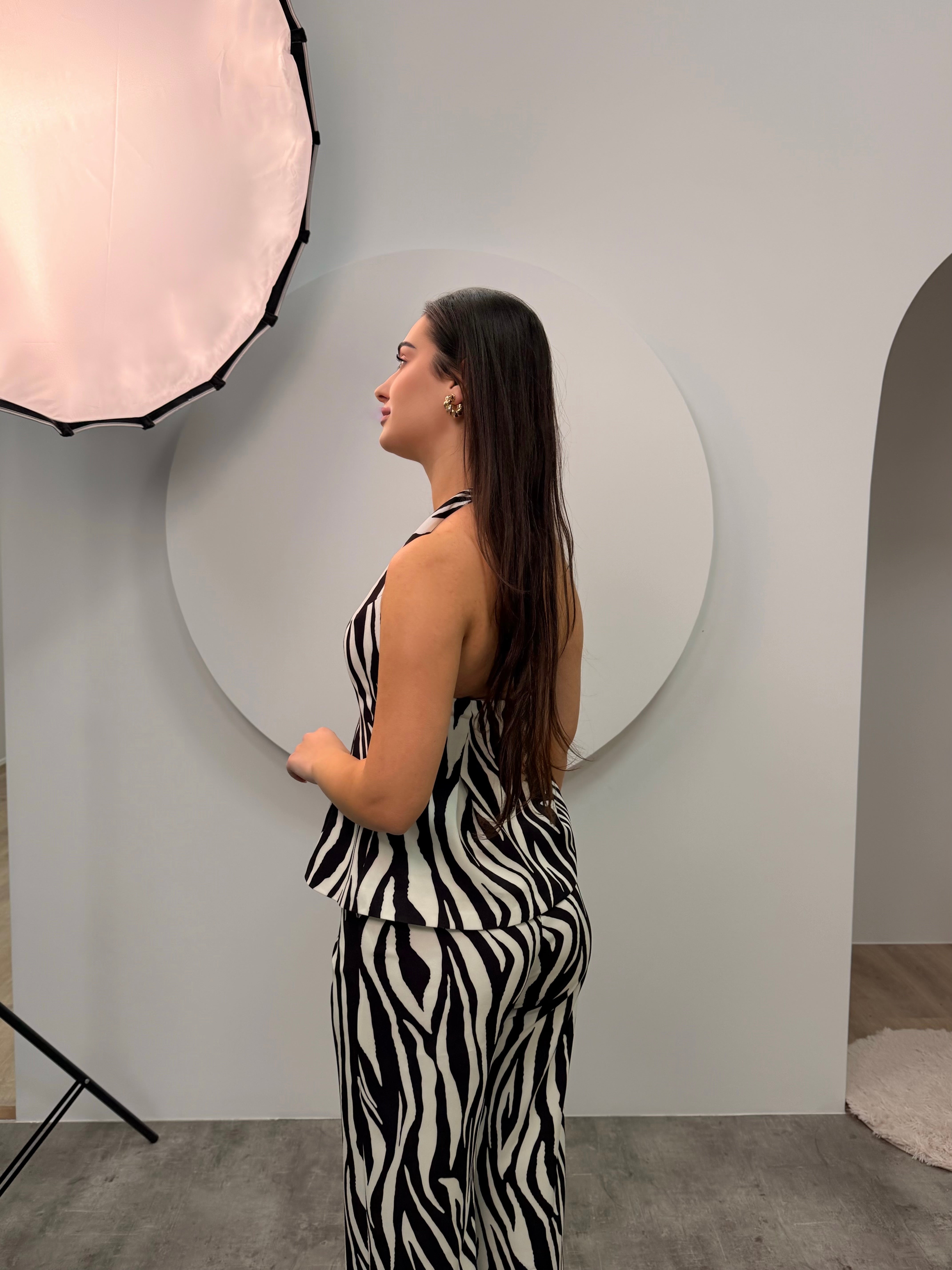 Kostum bardhe e zi me dizenjo zebre. Teper i vecante pantallona te gjera + jelek