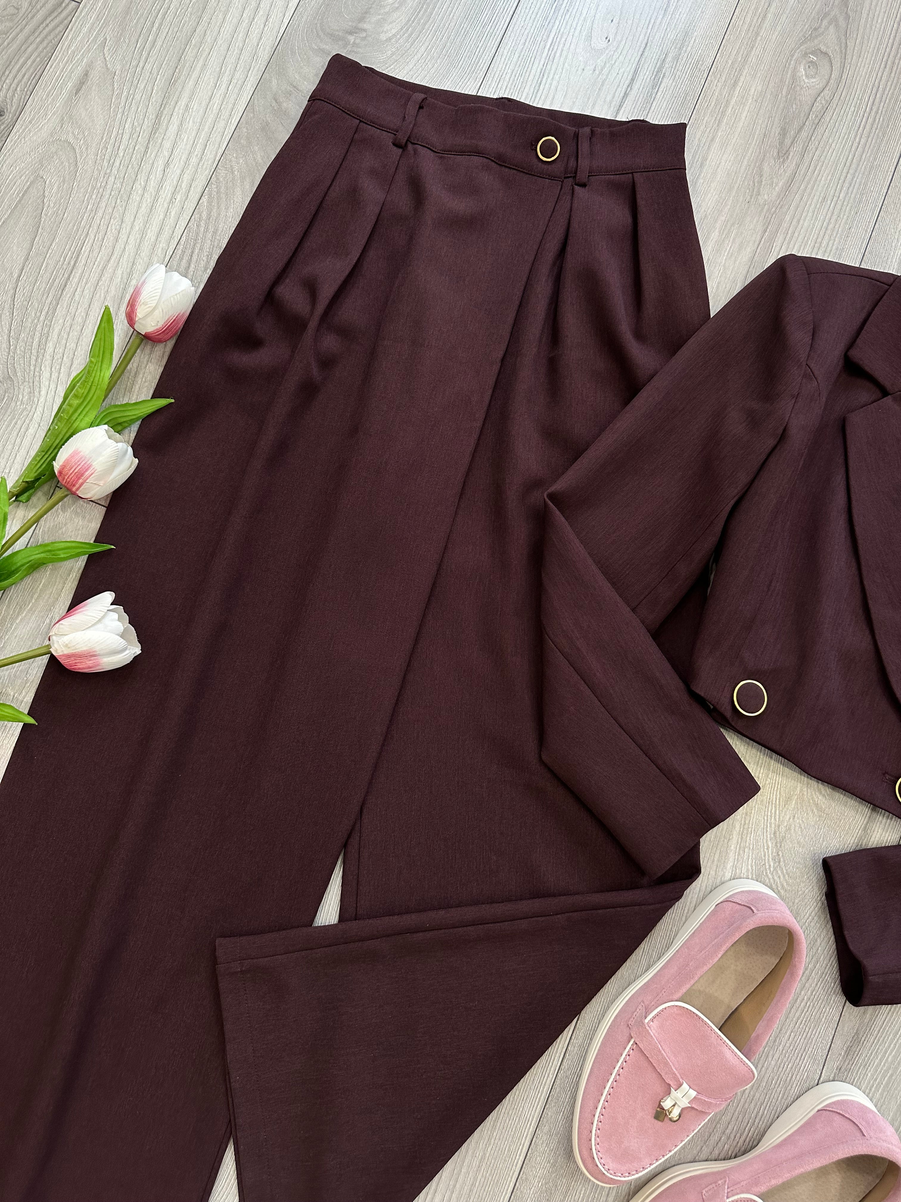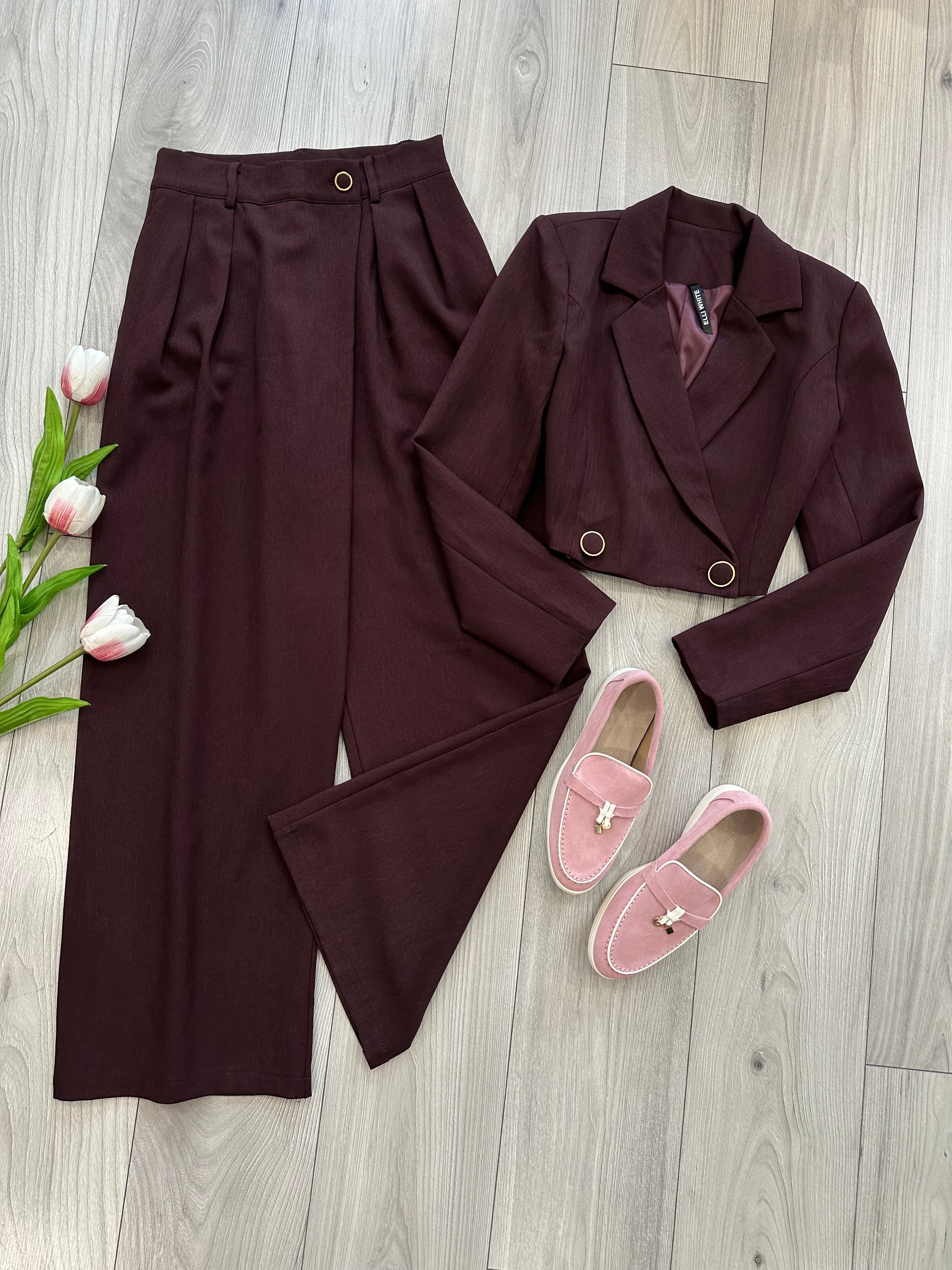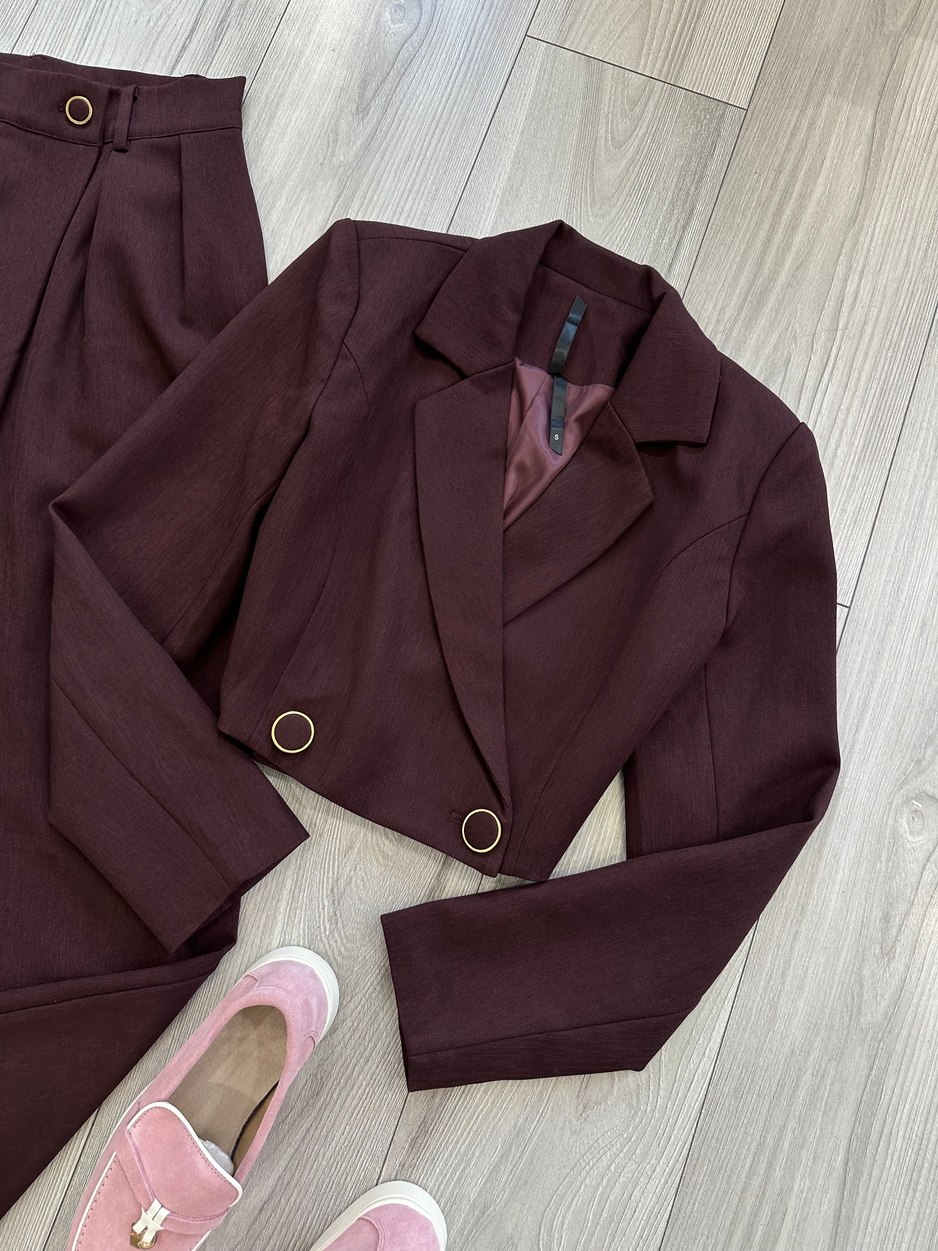 Kostum xhakete e shkurter me pantallona me bel te larte